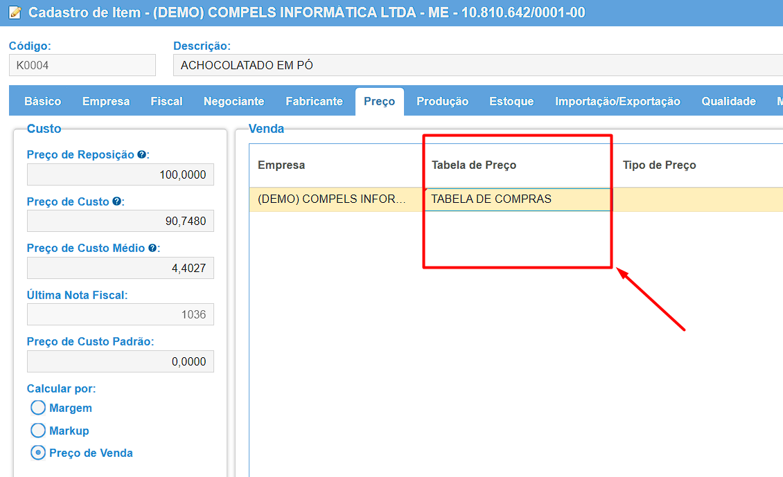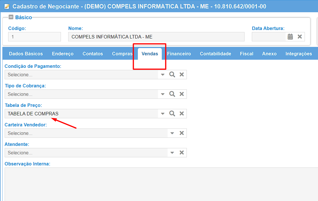 Vá no cadastro de negociantes, acesse o fornecedor e vá na aba Vendas. No campo "Tabela de preço, escolha a tabela".