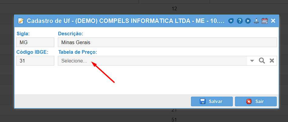 Acesse o "Cadastro de unidade federativa", localiza a unidade, acesse-a clicando duas vezes e no campo "Tabela de Preço" vincule a tabela.