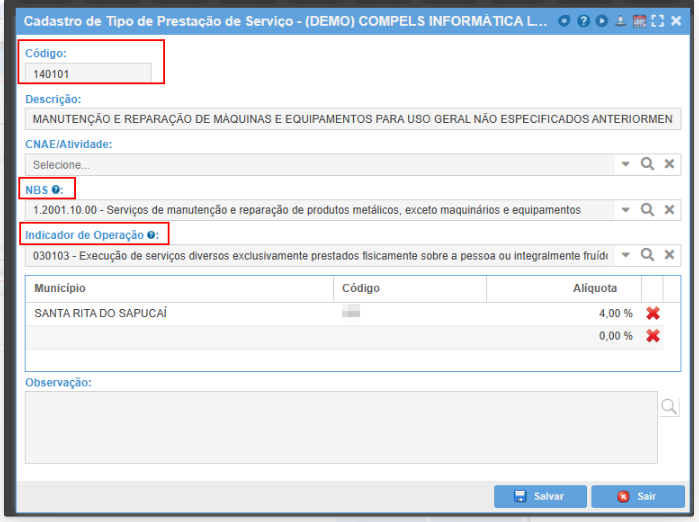 Contudo, **Alíquota de ISS não será enviada via xml mas obrigatório preencher de acordo com a tabela nacional no Tipo de Prestação de Serviço: