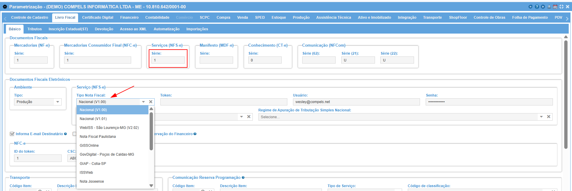 Escolha o Tipo Nota Fiscal conforme o adoto para prefeitura que irá emitir a nota. Para as prefeituras que adotaram o ambiente nacional, escolha o nacional (V. 1.01), para as demais escolha o sistema utilizado na prefeitura do município.